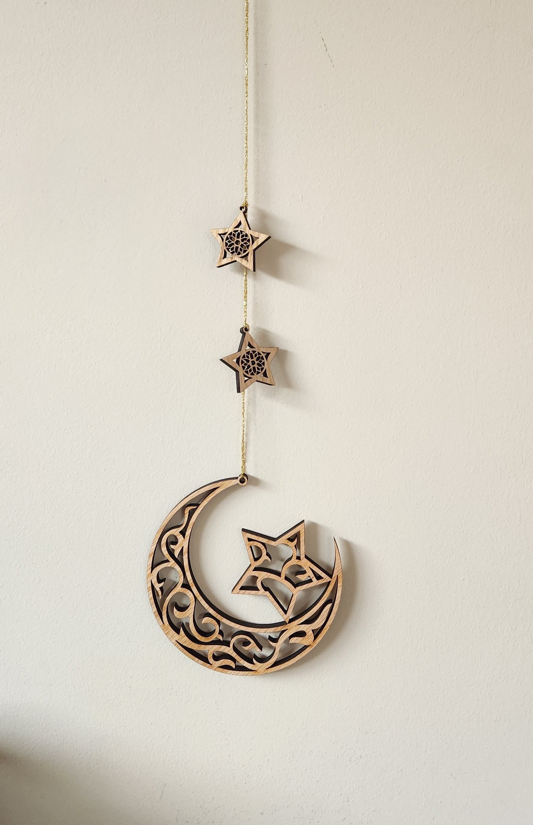 Celebrate the festive spirit with this elegant wooden wall decoration. Featuring a stunning laser-cut crescent moon and star filled with intricate geometric patterns. A small, dangling star accent completes the look. Perfect for adding a touch of warmth, light, and traditional artistry to your home during Ramadan and Eid al-Fitr or Eid al-Adha.