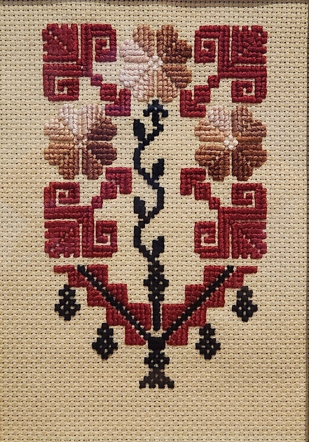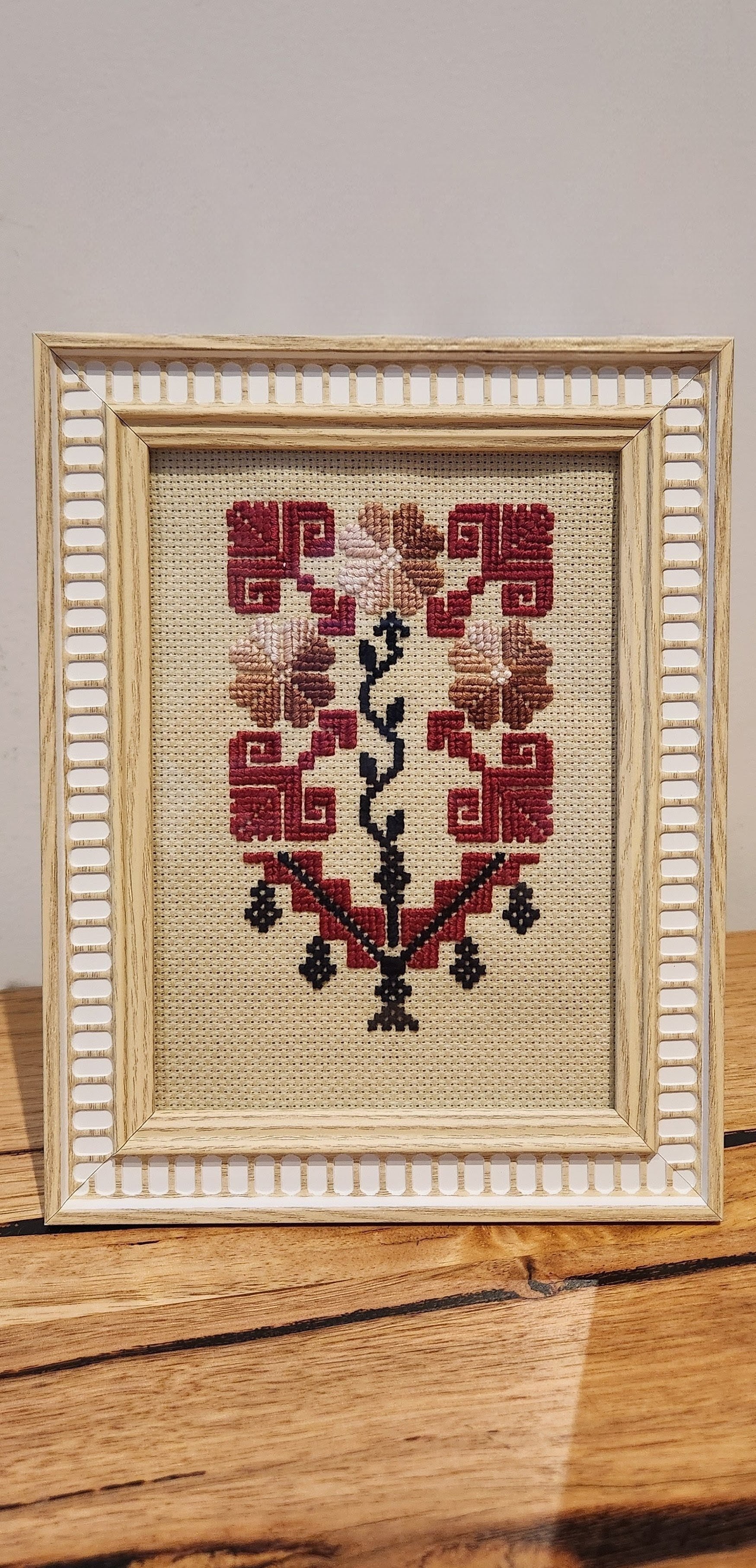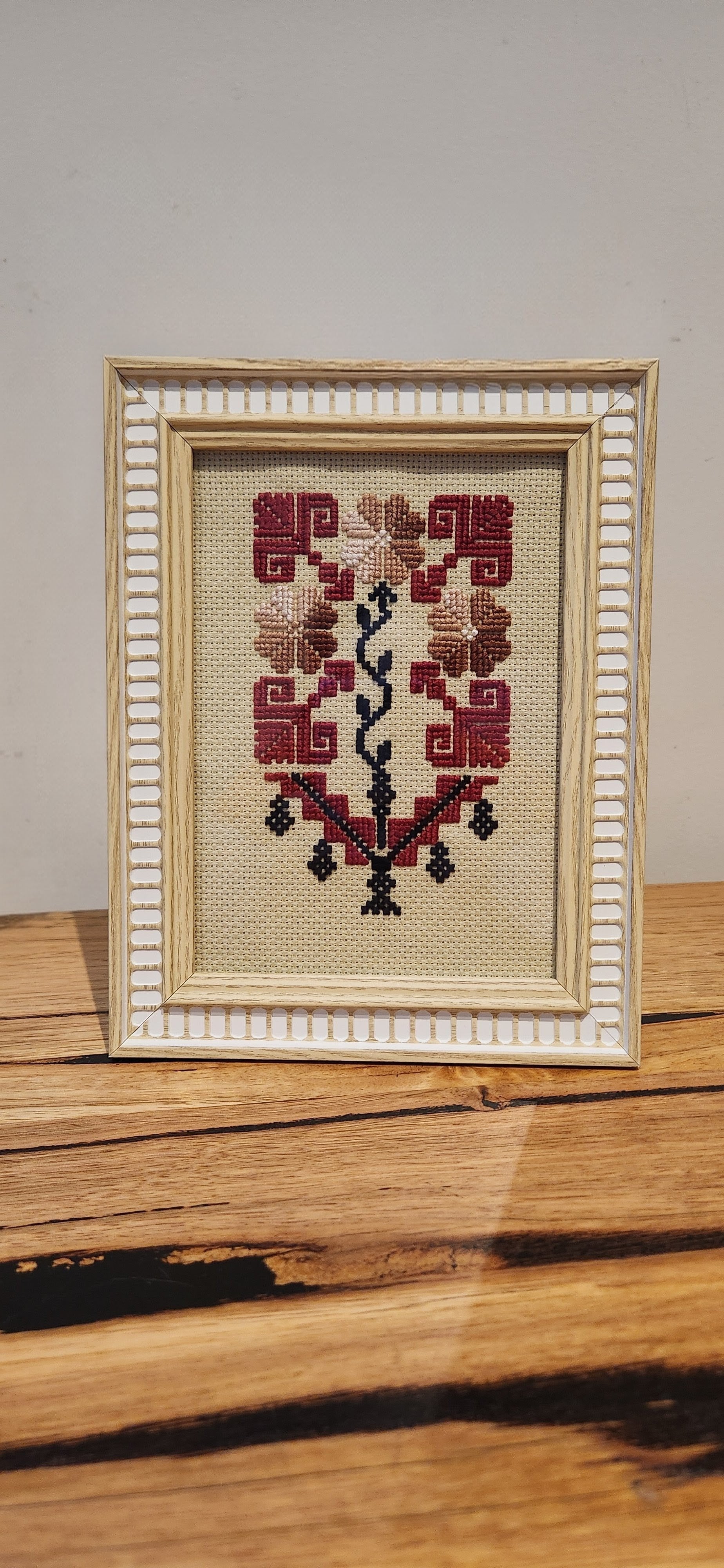 This hand-embroidered Tatreez piece features traditional flower motifs—symbols of life, love, and fertility. A beautiful tribute to Palestinian heritage, it represents hope for our people. The design originates from Hebron.