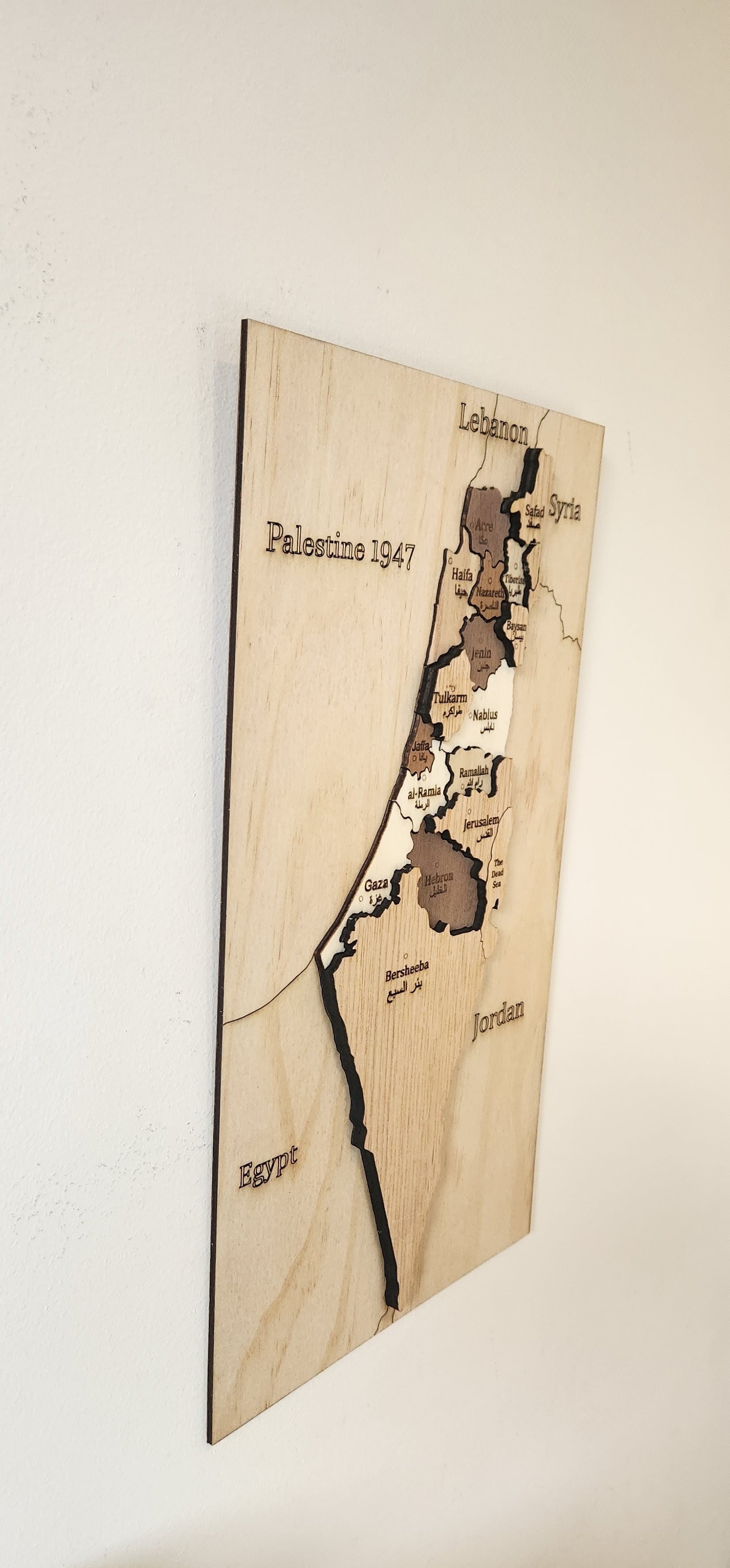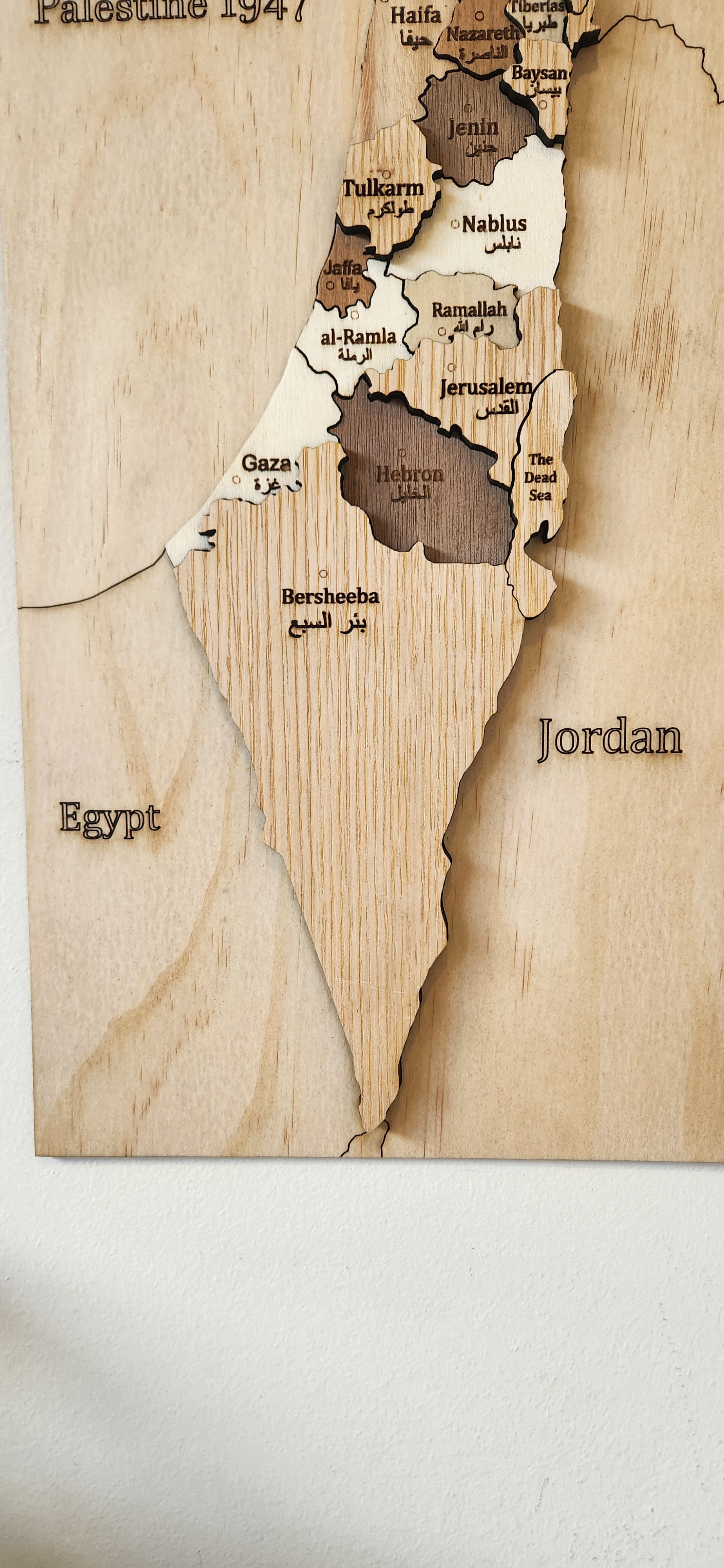 Each map is unique and a one off style, handcrafted with care as a tribute to the beauty and memory of Palestine as it was in 1947, before the Nakba (catastrophe).
