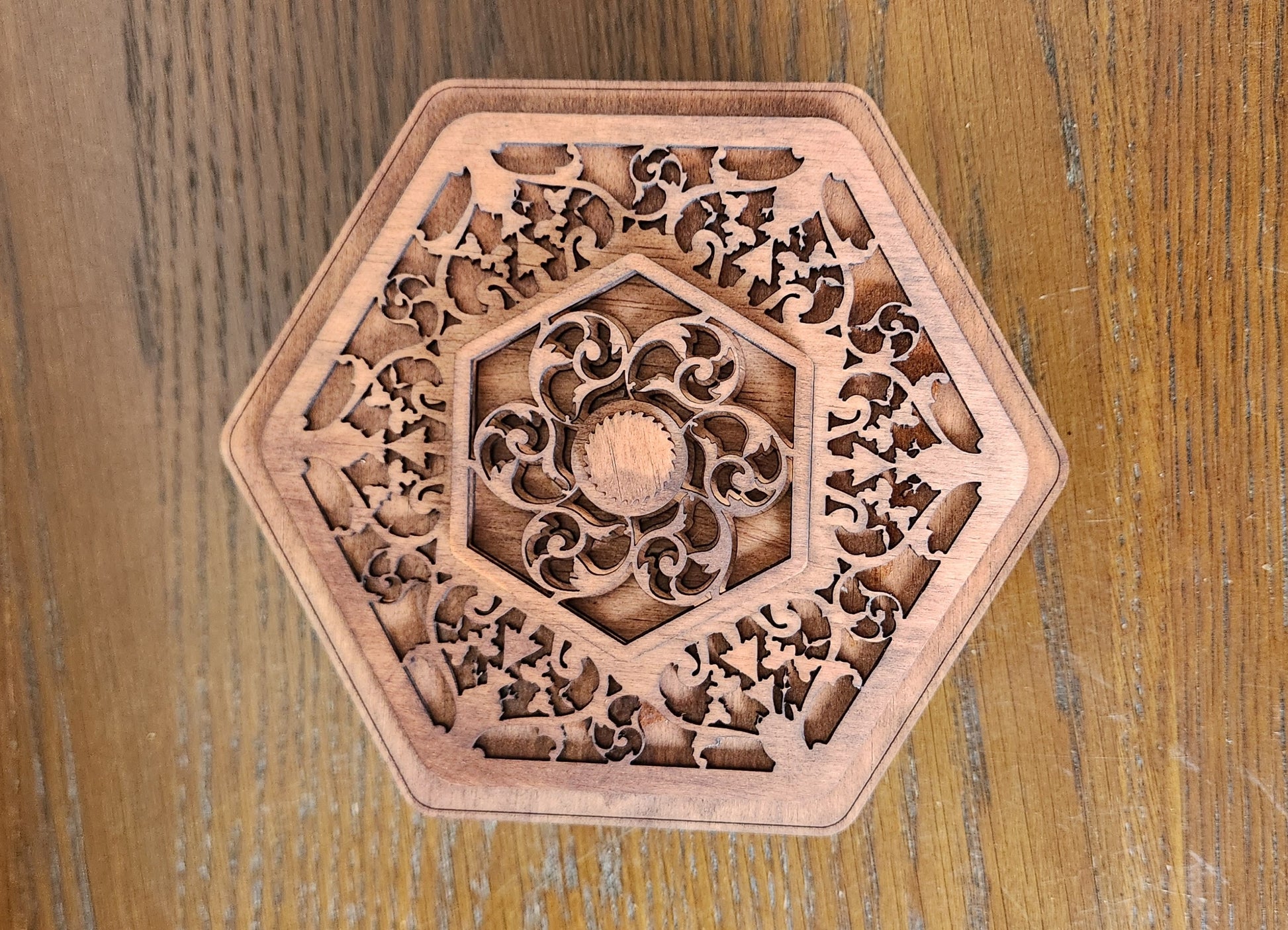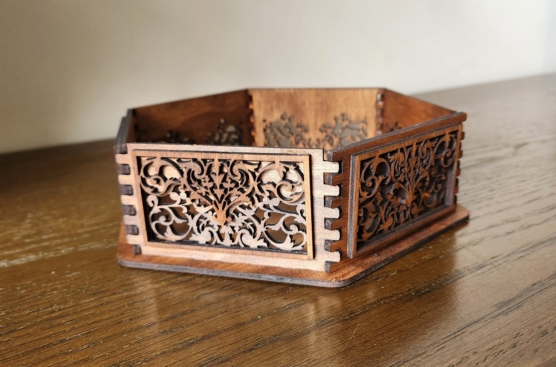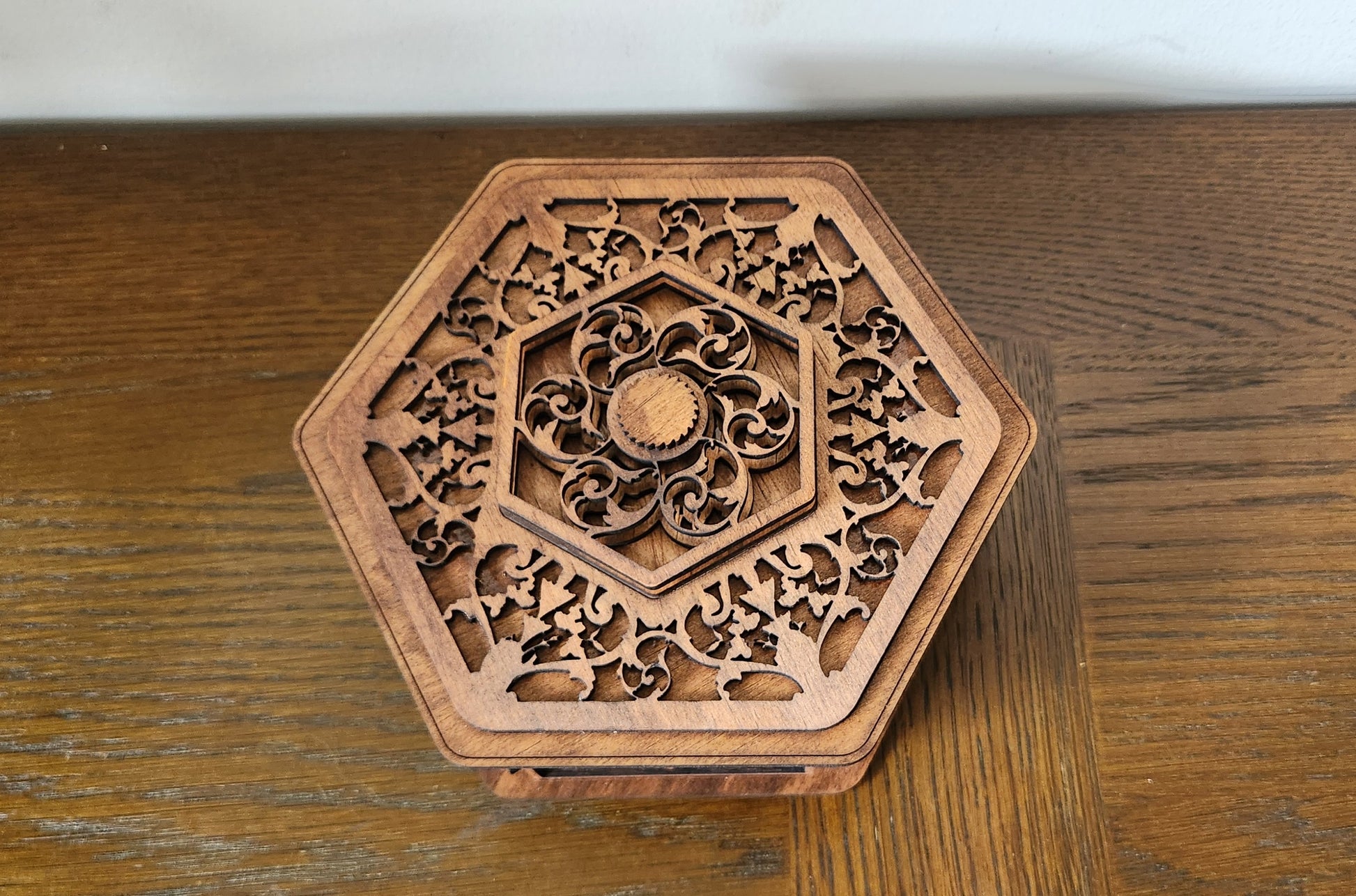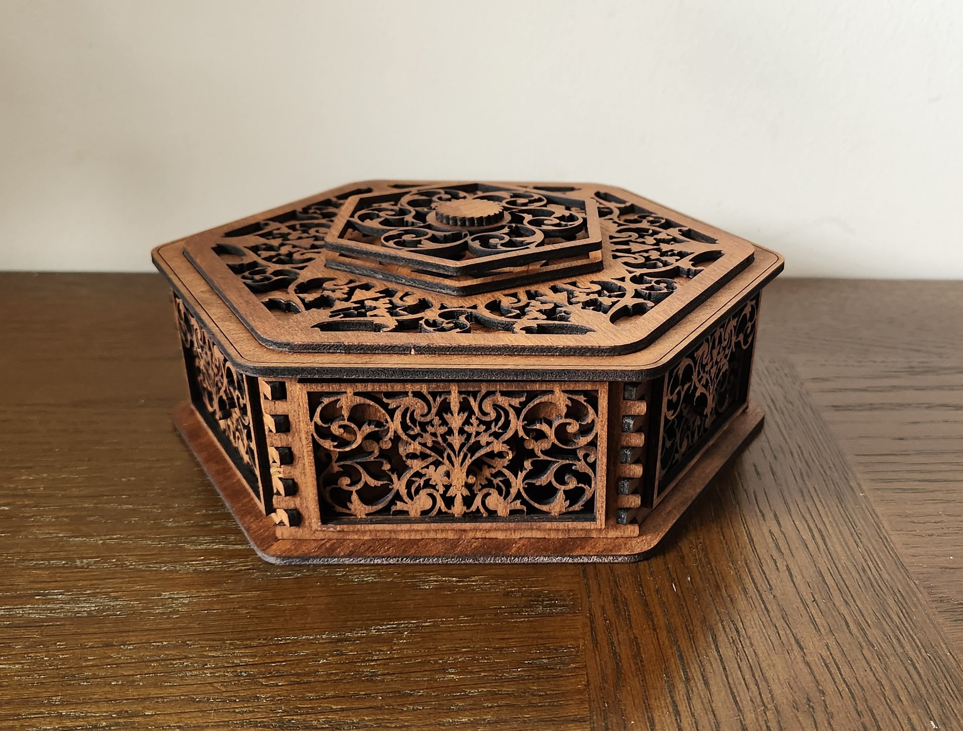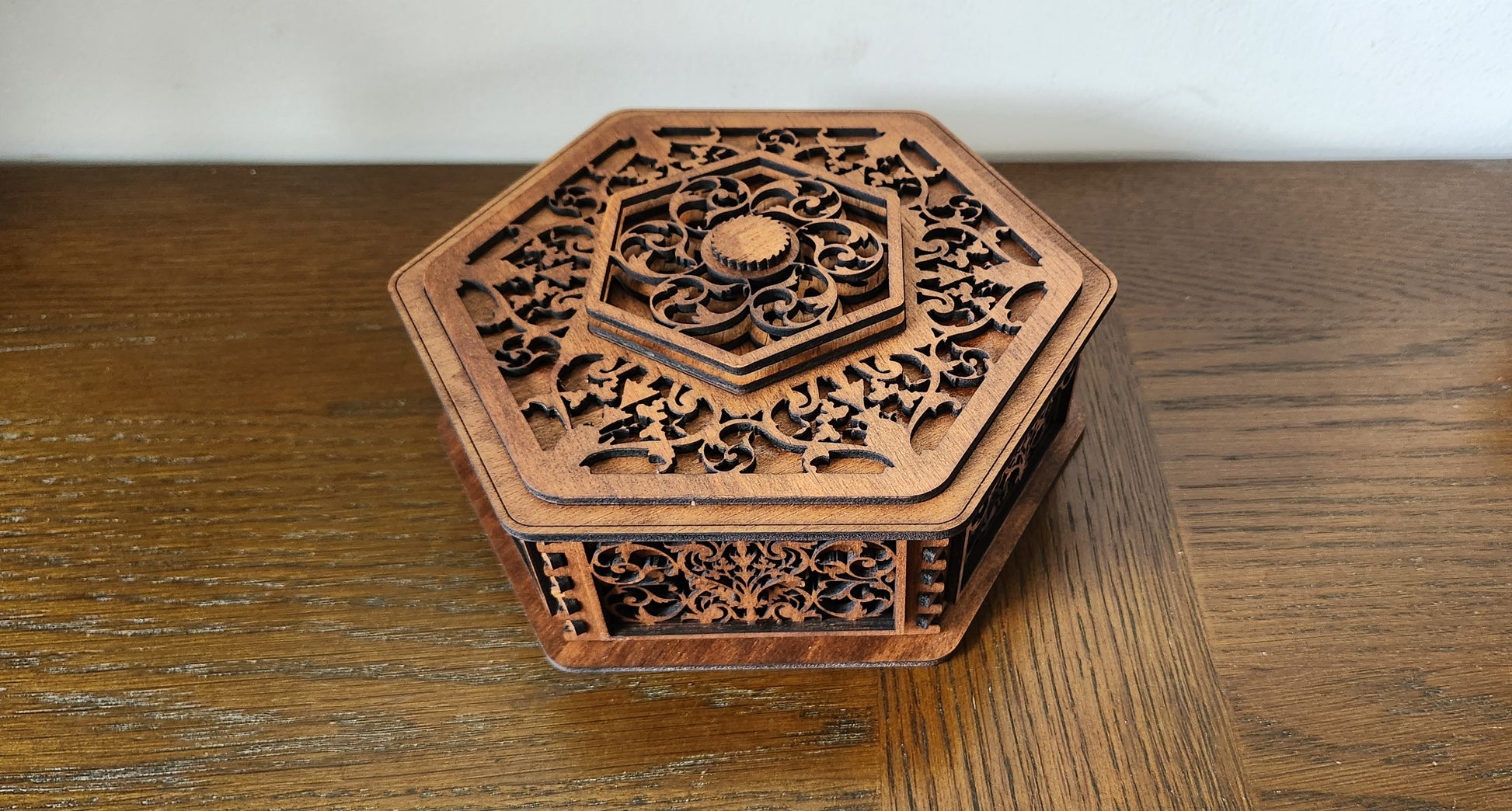 Store your most treasured pieces in this stunning, laser-cut wooden box. Crafted in a unique hexagonal shape, it features exceptionally detailed filigree scrollwork on the lid and all sides, giving it a rich, vintage, or Moroccan-inspired elegance. Perfect as a jewelry box, a memory keepsake, or a decorative accent piece. It’s a work of art that beautifully protects your valuables.