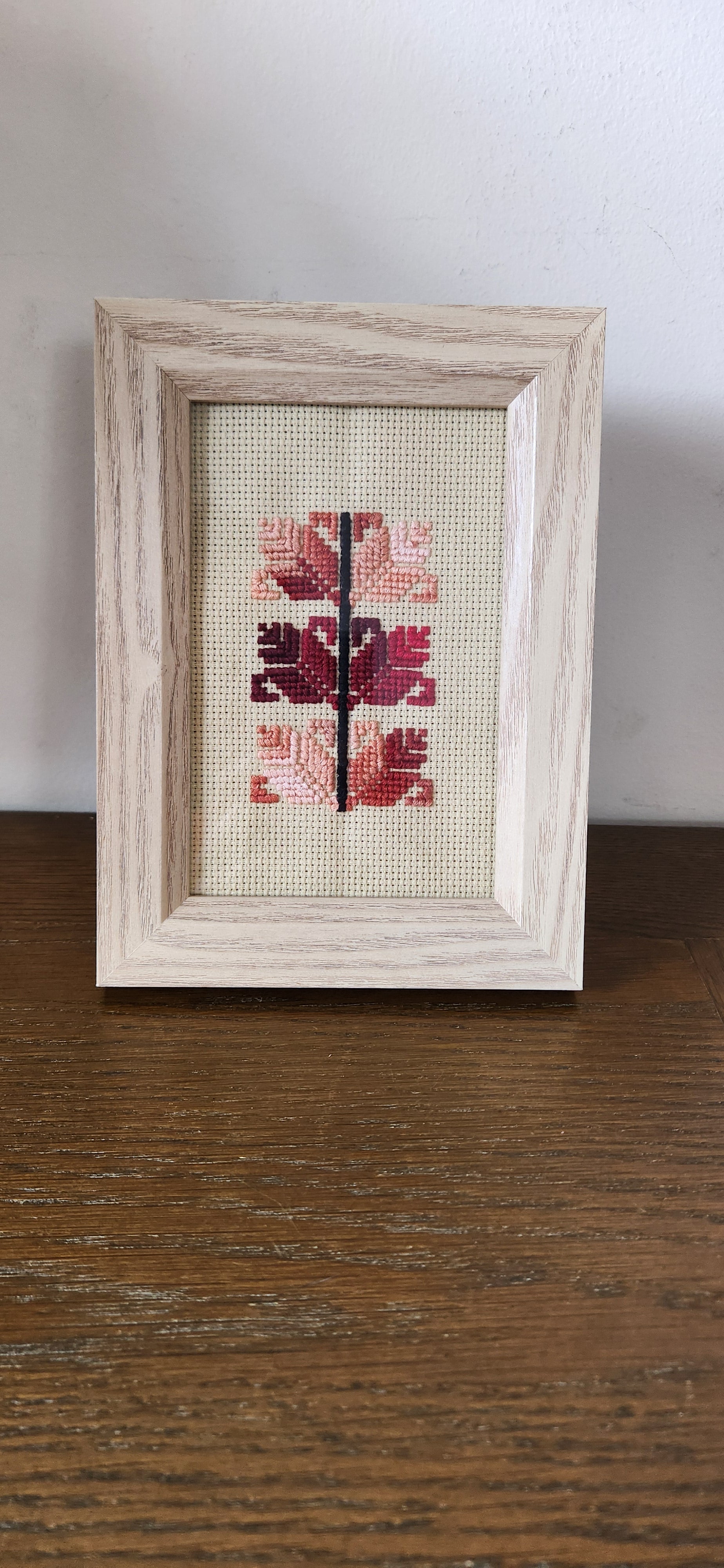 Celebrate the rich heritage of Palestinian embroidery with this exquisite Tatreez piece. Hand-stitched with care, this design features a traditional clove motif in a stunning ombre palette of reds, burgundies, and pinks. The vertical black line grounds the pattern, creating a striking visual balance. Framed and ready to display, this piece is a meaningful way to bring cultural artistry and vibrant texture into your home.